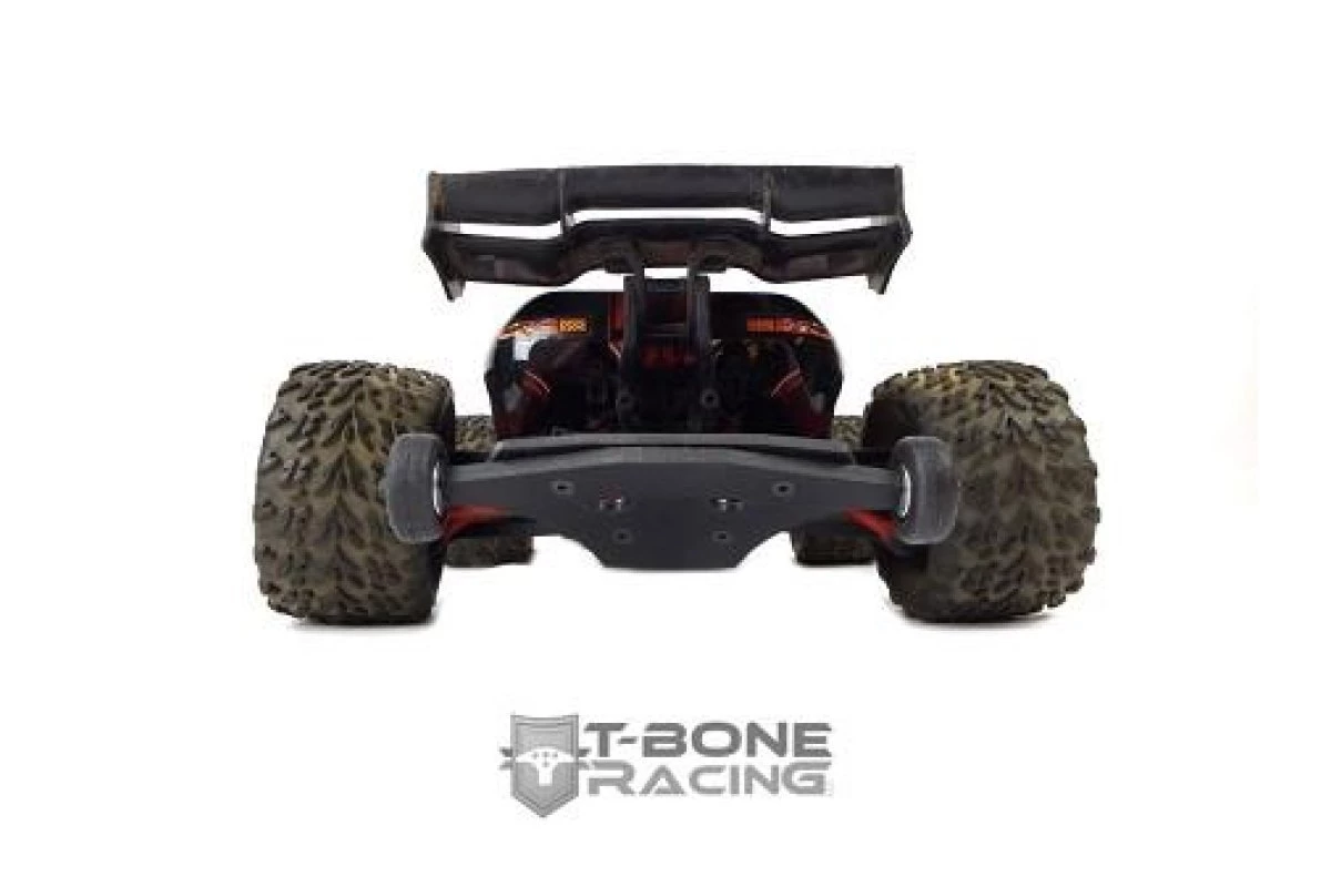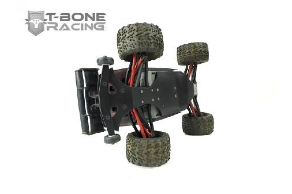 L’accessoire pour châssis pour l’E-Revo 1/16 est en nylon noir de.125″ et pèse 2,5 oz. Il est monté avec 13 vis pour répartir l’impact sur toute la longueur de votre châssis.Les pare-chocs avant et arrière boulonnent à l’avant et à l’arrière du châssis avec 2 vis et 2 écrous de verrouillage chacun. Vous avez un choix de trois boulons avant sur les pare-chocs à vérifier.a Thrasher.T-Bone utiliser des vis de tête Phillips que les têtes de prise se détachent trop facilement.Le 1/16 Wheelie Bar est livré avec des pneus en caoutchouc et des roues en aluminium. Il boulonne sur le pare-chocs arrière avec 2 vis et 2 écrous de verrouillage.